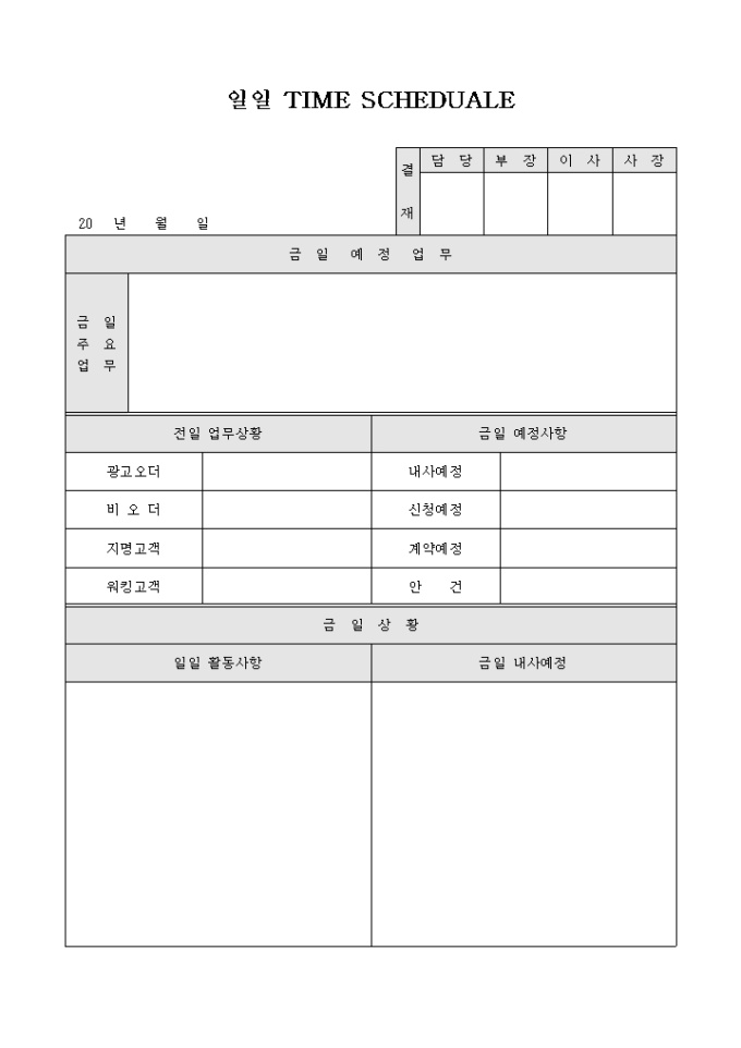 일일TIME SCHEDUALE표 양식입니다. 금일주요업무와 전일 업무상황, 금일예정사항, 금일의 일일활동사항과 금일내사예정 등의 항목으로 구성되어 있습니다.