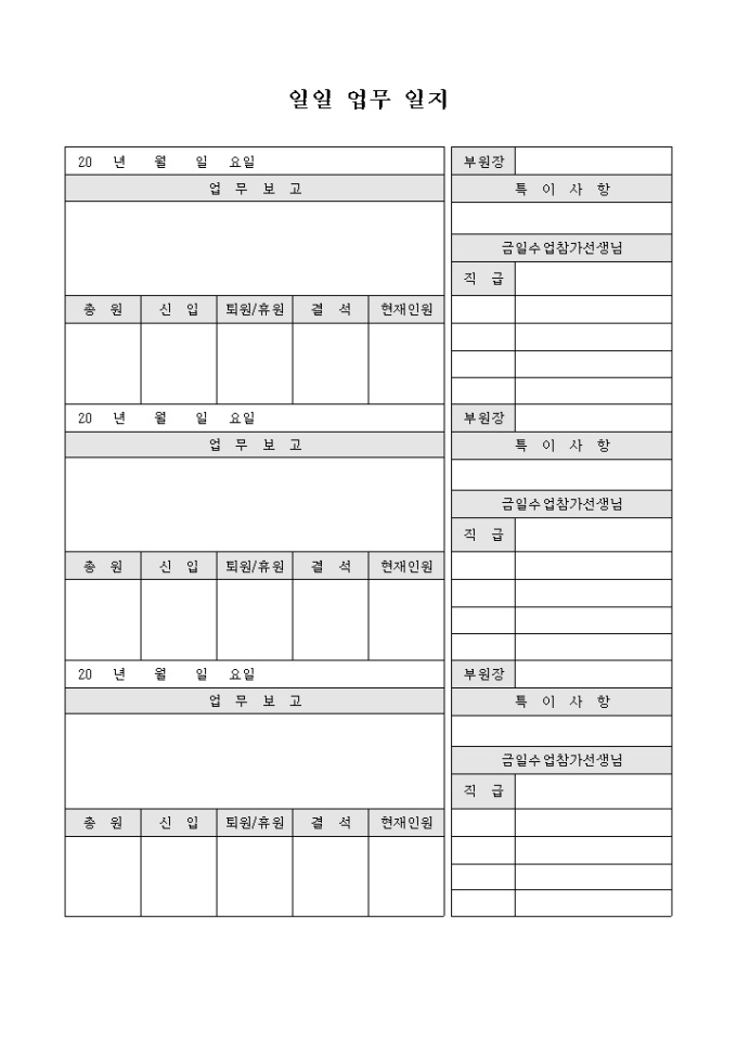 9,000원/월학교 및 학원에서 사용할 수 있는 일일업무일지 양식입니다. 업무보고, 특이사항, 총원, 신입, 퇴워/휴원, 결석, 현재인원 등의 항목으로 구성되어 있습니다.