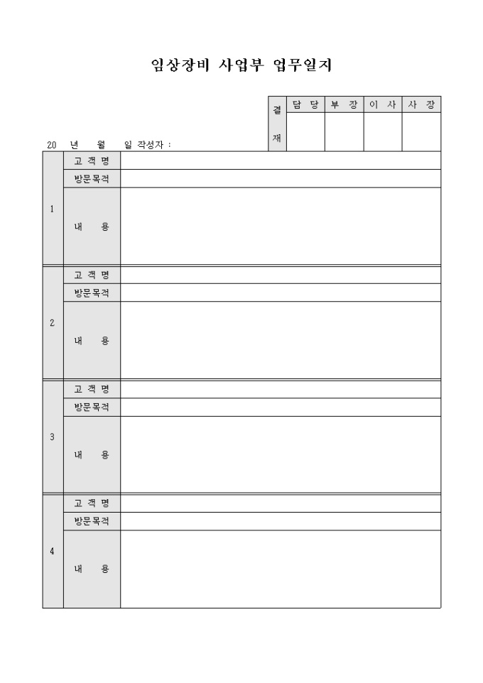 9,000원/월임상장비 사업부 에서 사용하는 업무일지 양식입니다. 방문한 고객명과 고객목적, 방문내용 등을 기재할 수 있습니다.