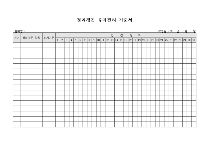 9,000원/월정리정돈 유지관리 기준서 양식입니다. 정리정돈 항목과 유지기준, 요일별 점검 상황을 확인 할 수 있도록 한 정리정돈 유지관리 기준서 양식입니다.