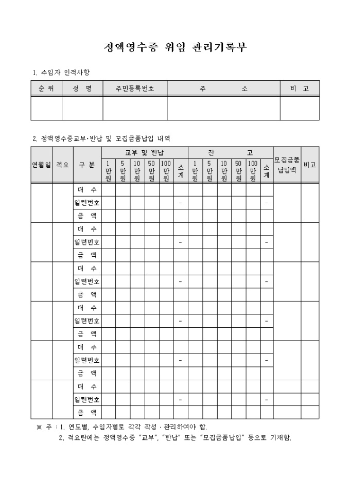 정액영수증 위임관리 기록부 양식입니다. 수임자의 인적사항과 정액영수증 교부/반납 및 모집금품납입 내역 등의 항목으로 구성되어 있습니다.