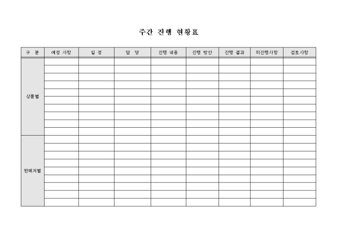 상품별, 판매처별 주간업무 진행 현황표 양식입니다. 예정사항, 일정, 담당, 진행내용, 진행방안, 진행결과, 미진행사항, 검토사항 등의 항목으로 구성되어 있습니다.
