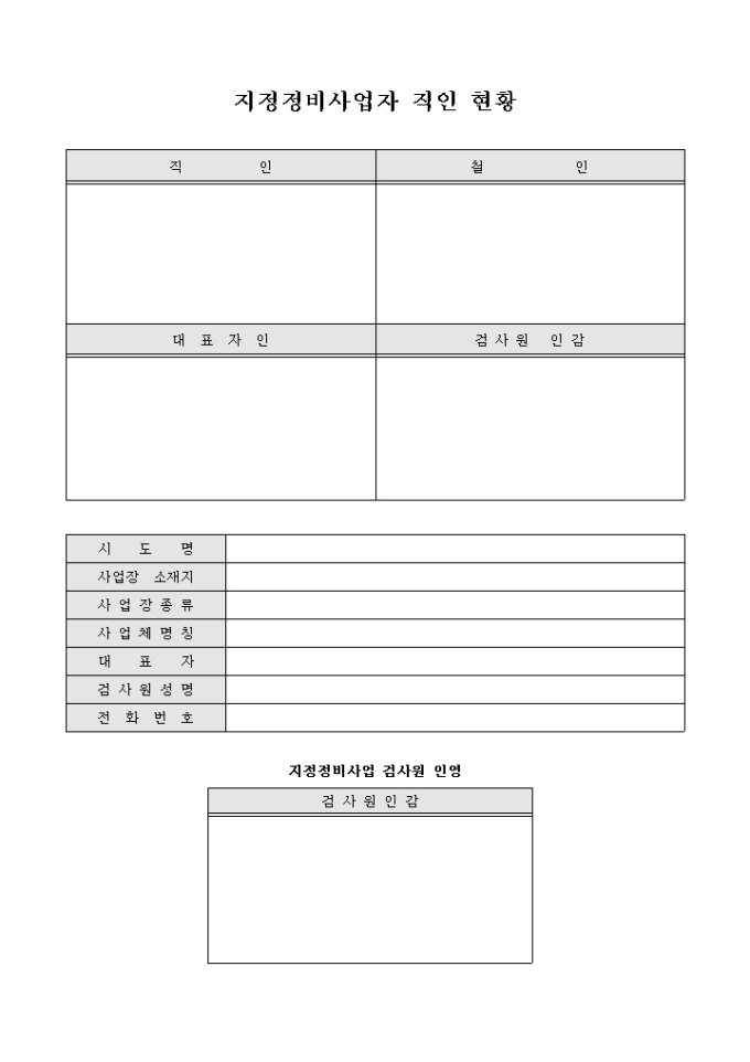 지정정비사업자의 직인현황을 나타내는 표 양식입니다. 직인, 철인, 대표자인, 검사원 인감 등을 표시할 수 있습니다.
