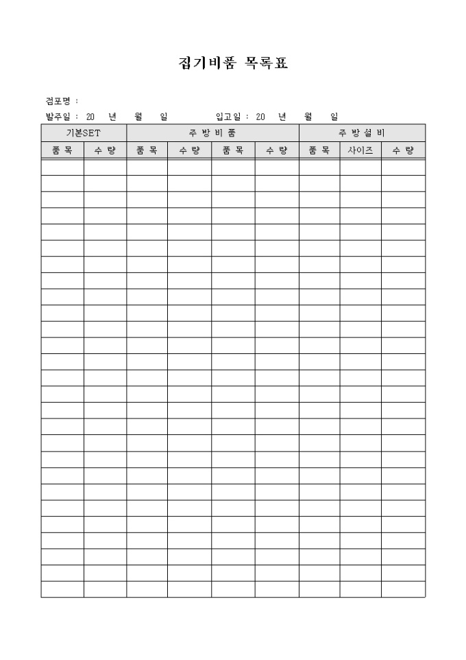 집기비품목록표 양식입니다. 기본세트, 주방비품, 주방설비 등의 품목, 수량등의 항목을 기재 할 수 있습니다.