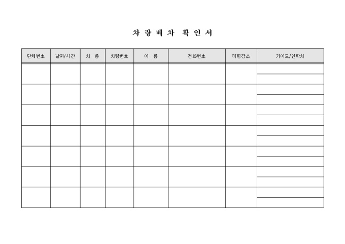 9,000원/월차량배차확인서 양식입니다. 단체번호, 날짜, 차종, 차량번호, 이름, 전화번호, 미팅장소, 가이드/연락처 등의 항목으로 구성되어 있습니다.