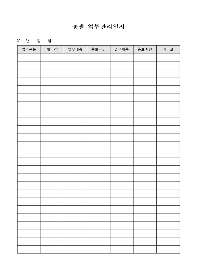 9,000원/월총괄업무를 관리하기 위한 업무관리 일지입니다. 업무구분, 대상, 업무내용, 종료시간등으로 구성됩니다.