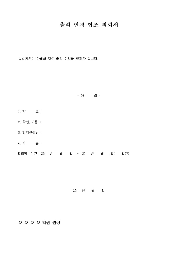 출석인정 협조를 의뢰하기 위해 사용하는 문서입니다.