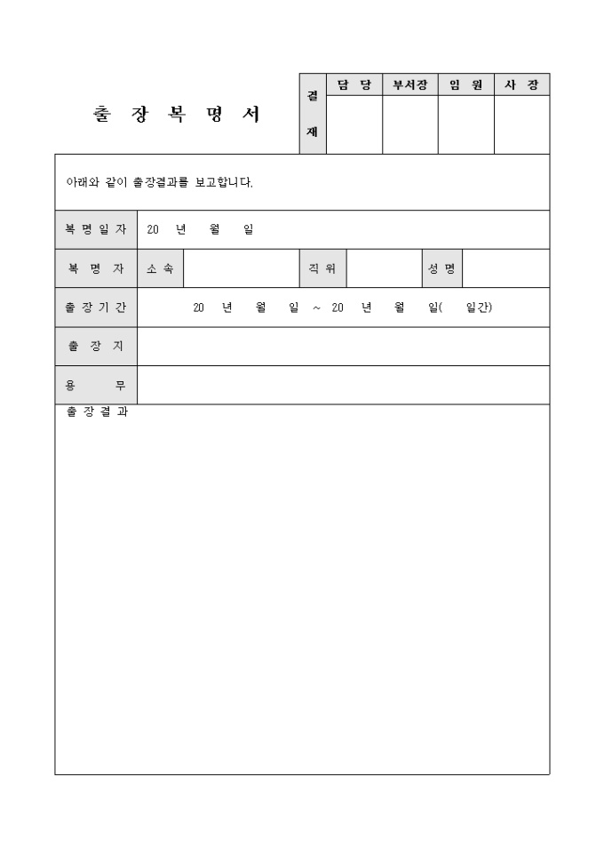 9,000원/월출장결과를 보고하기위해 사용되는 출장복명서 입니다. 출장자와 출장결과등으로 구성됩니다.