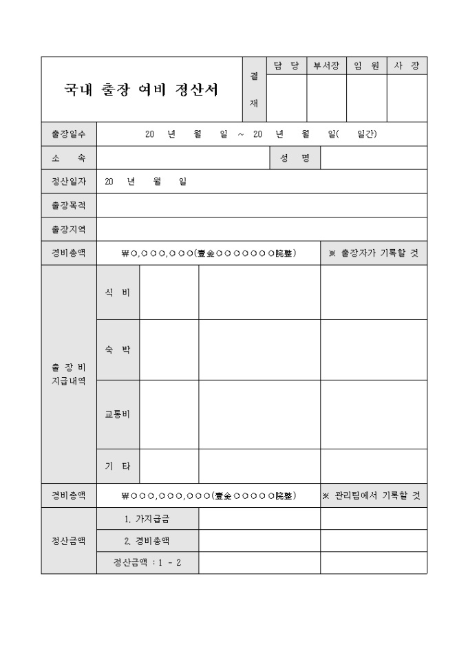 9,000원/월출장여비정산시 사용되는 정산서입니다. 국내에서 사용하기 편리하게 구성되어 있습니다.