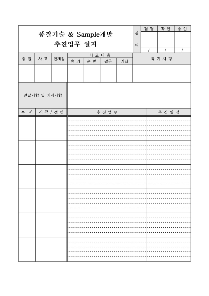 9,000원/월품질기술 및 샘플개발 추진업무 일지입니다. 샘플개발의 추진업무와 추진일정등으로 구성되어 있습니다.