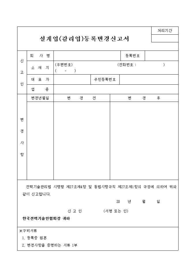 전력기술관리법 시행령 제27조제4항 및 동법시행규칙 제27조제1항의 규정에 의하여 위와 같이 신고하실때 사용하는 양식입니다.