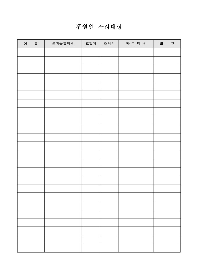 후원인 관리 대장입니다. 이름과 후원인, 후원인의 카드번호 등으로 구성되어 있습니다.