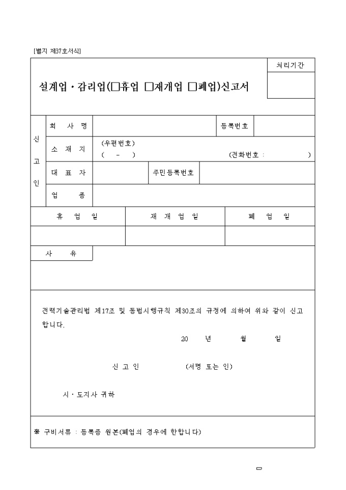 전력기술관리법 제17조 및 동법시행규칙 제30조의 규정에 의하여 위와 같이 신고하실때 사용하는 양식입니다.