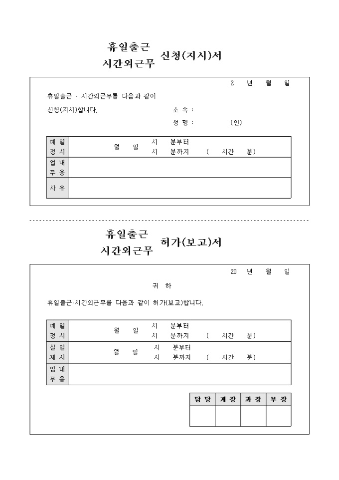 9,000원/월휴일출근, 시간외 근무를 신고하고자 할때 사용하는 신청서입니다.