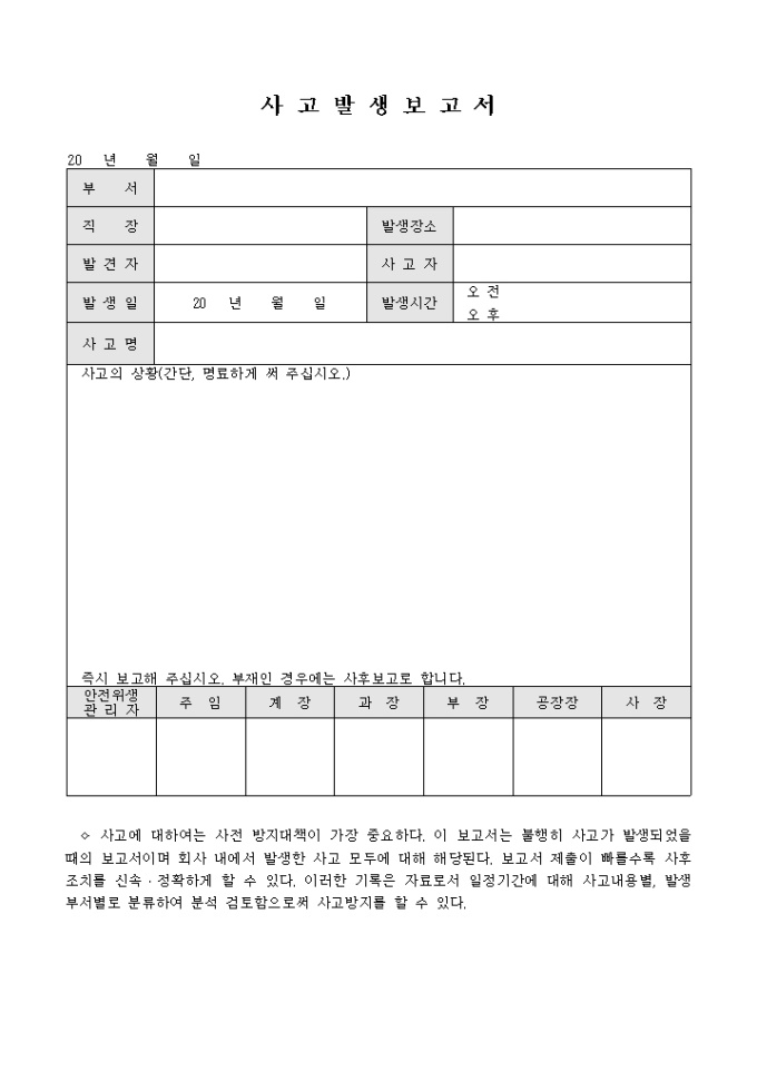 9,000원/월사고 발생 후 작성하는 사고발생 보고서 양식입니다. 사고 발생장소, 발견자, 사고자, 발생일, 발생시간, 사고명, 사고상황 등의 내용을 기재할 수 있습니다.