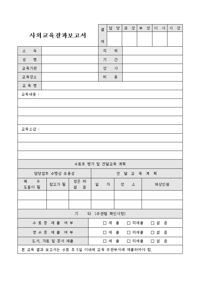 9,000원/월사외교육 결과 보고서 양식입니다. 교육기관, 강사, 교육장소, 교육명, 교육내용, 수료후 평가 및 전달교육 계획 등의 항목으로 구성되어 있습니다.