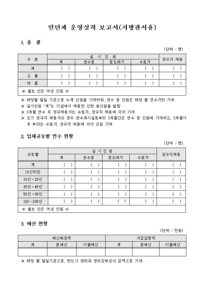 지방관서에서 사용할 수 있는 인턴제운영실적 보고서 양식입니다. 인턴제 실시인원과 업체규모별 연수현황, 예산현황 등의 내용을 기재 할 수 있습니다.