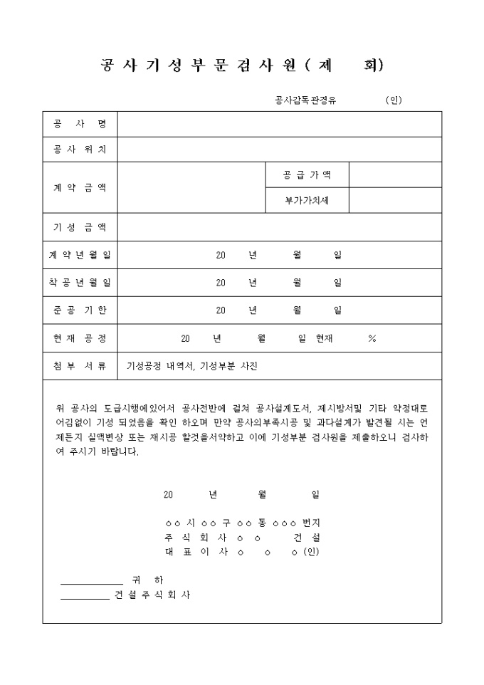 위 공사의 도급시행에있어서 공사전반에 걸쳐 공사설계도서, 제시방서및 기타 약정대로 어김없이 기성 되었음을 확인 하오며 만약 공사의부족시공 및 과다설계가 발견될 시는 언제든지 실액변상 또는 재시공 할것을서약하고 이에 기성부분 검사원을 제출하오니 검사하여 주시기 바랍니다.