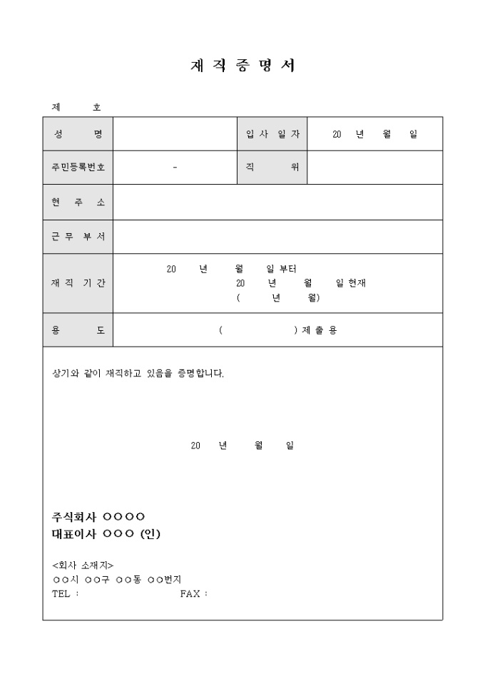회사에 재직하고 있음을 증명하는 재직증명서 양식입니다.