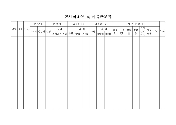 계약단가,계약금액,조정일이전,조정일이후,비목군 분류 등의 항목으로 구성된 양식입니다.
