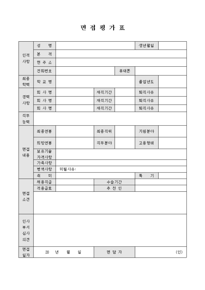 면접시 사용하는 면접평가서 양식으로 인적사항과 평가사항, 소견등의 항목으로 구성되어 있습니다.