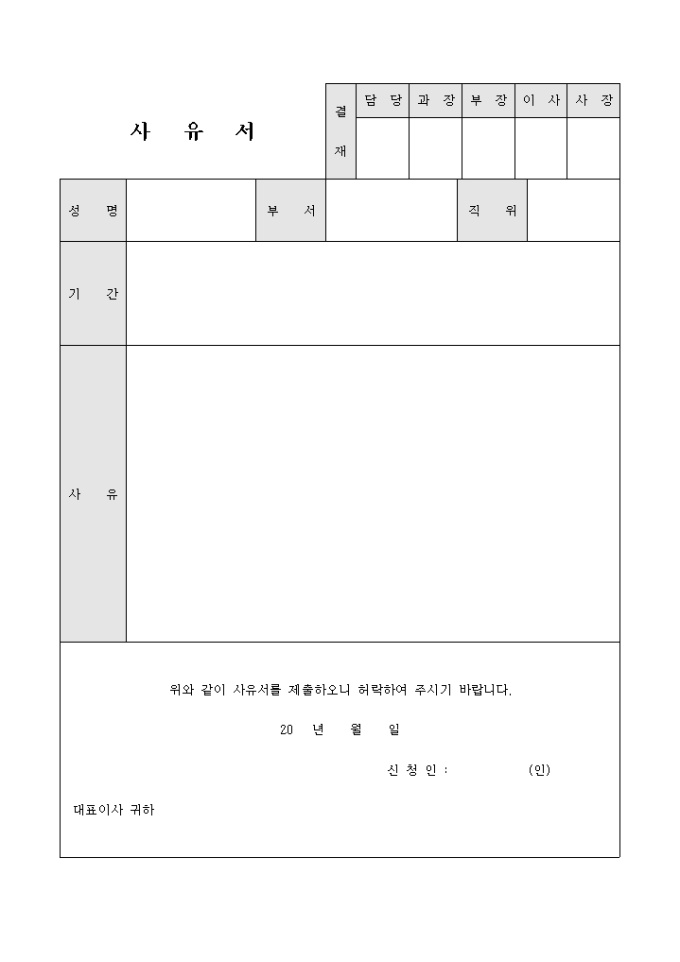 9,000원/월성명, 부서, 직위, 기간, 사유 등의 항목을 기재할수 있는 사유서 입니다.