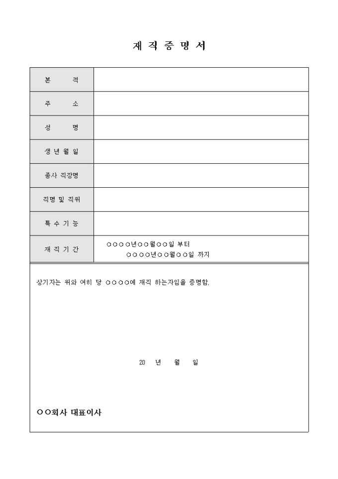 해당 기업에 재직하고 있음을 증명하는 재직증명서 양식입니다. 본적, 주소, 성명, 생년월일, 종사 직장명, 직명및 직위, 재직기간 등의 항목을 기재할 수 있습니다.