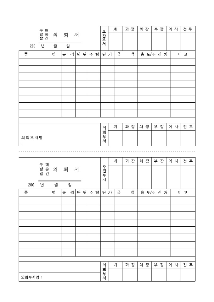 품명,규격,단위,수량,단가,금액,용도/수신처등의 항목으로 구성된 양식입니다.
