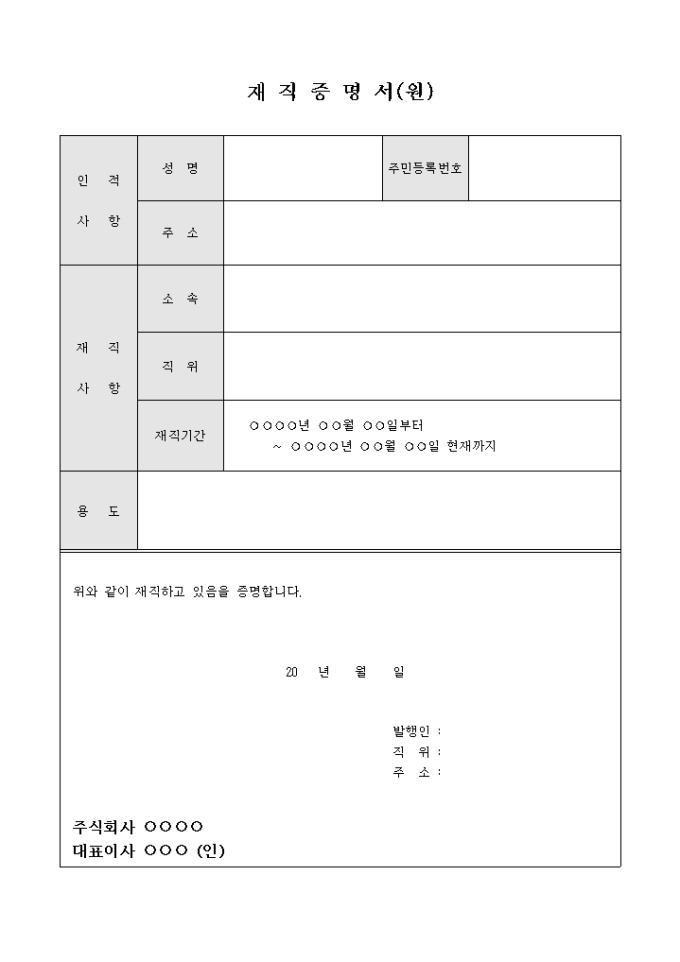 9,000원/월일반적인 재직증명서 양식입니다. 대상자의 인적사항, 재직사항, 용도 등의 항목을 기재할 수 있습니다.