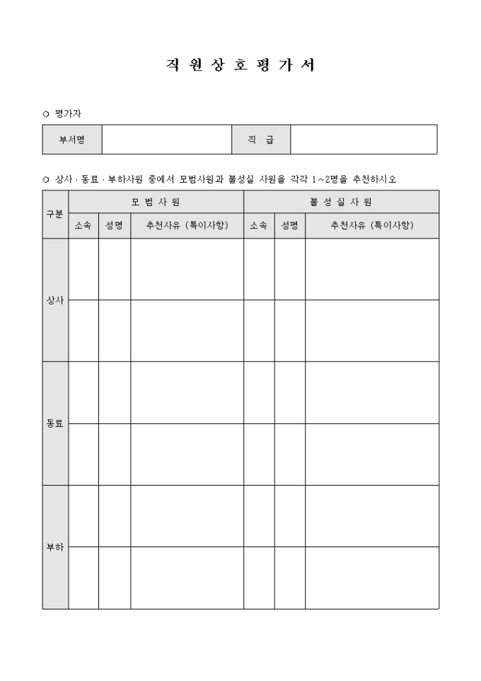 9,000원/월직원간 상호 평가시 사용되는 평가서 로써 모범사원과 불성실 사원등을 기록할수 있습니다.