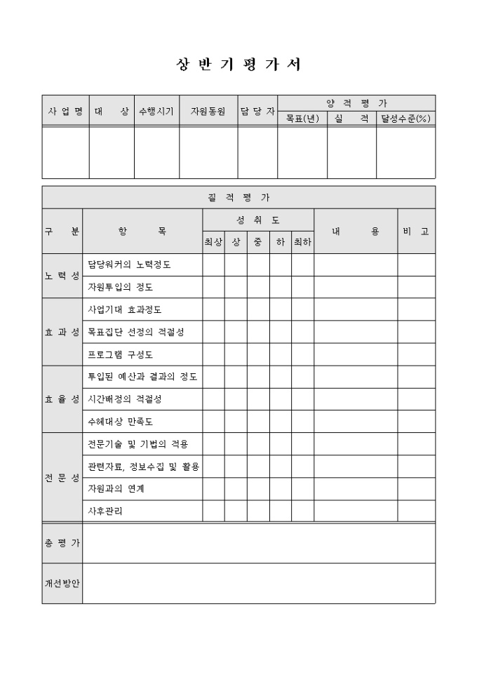 상반기 평가서로 노력성, 효과성, 효율성, 전문성, 총평가, 개선방안 등의 항목으로 구성되어 있습니다.