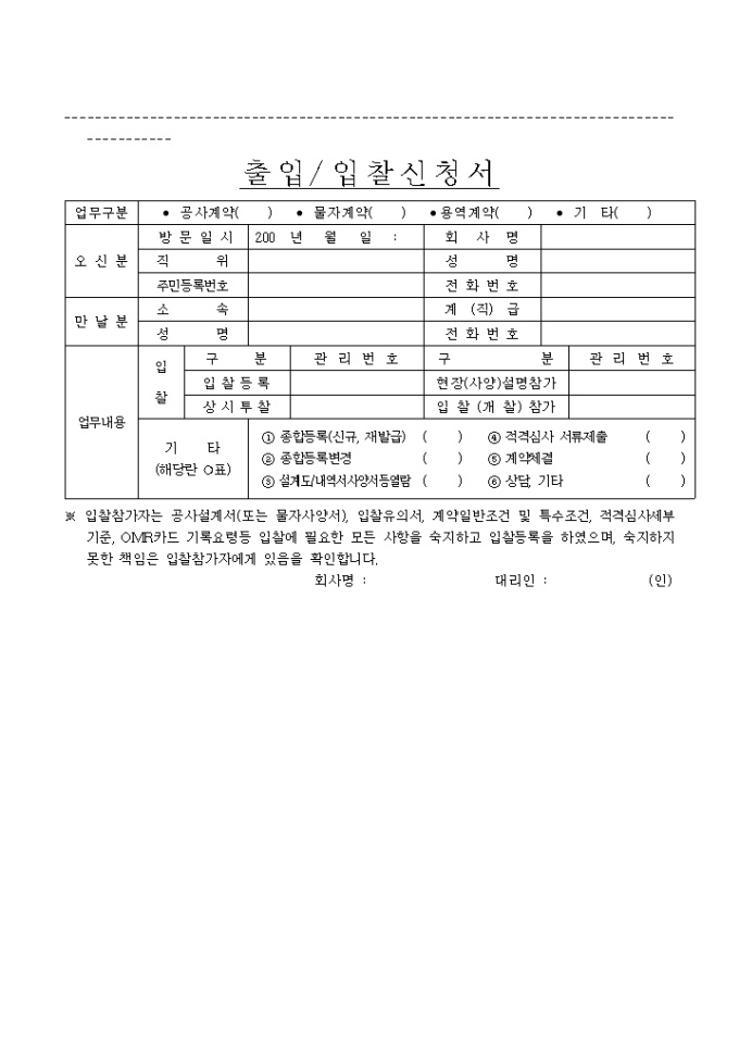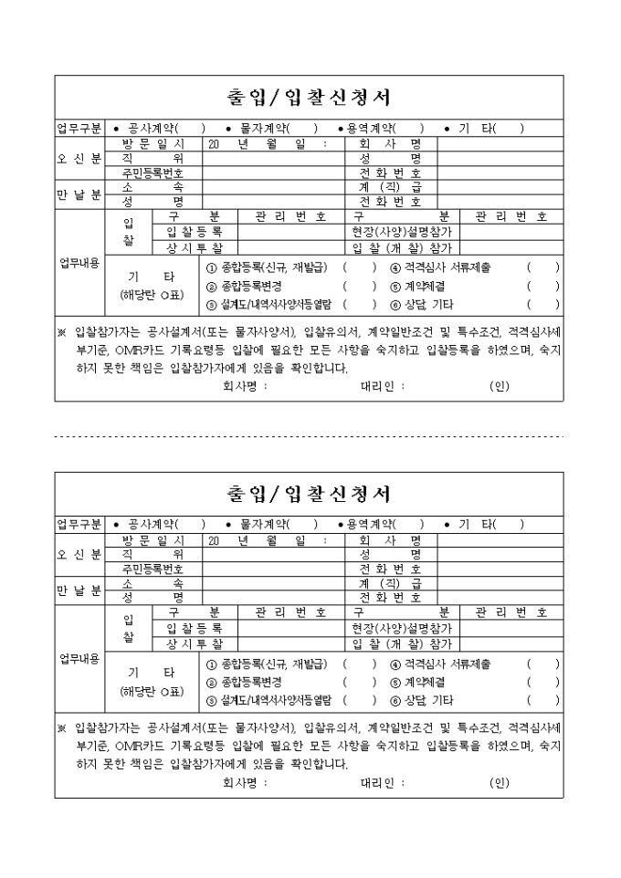 9,000원/월입찰참가자가 공사설계서(또는 물자사양서), 입찰유의서, 계약일반조건 및 특수조건, 적격심사세부기준, OMR카드 기록요령등 입찰에 필요한 모든 사항을 숙지하고 입찰등록을 하며 이에 입찰을 신청하는 양식입니다. 내용은 오신분, 만날분, 업무내용등을 작성합니다.