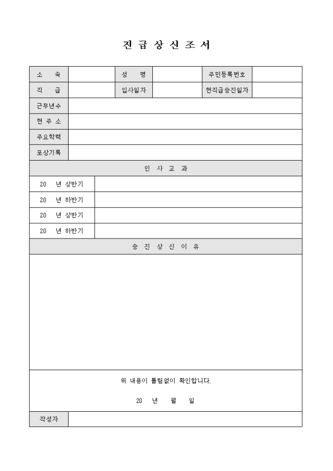 9,000원/월진급상신조서입니다. 인사고과기록과 승진상신 이유등으로 구성됩니다.