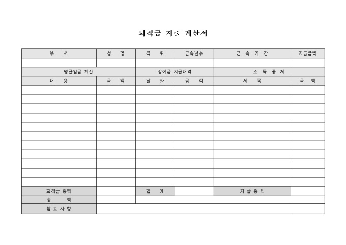 퇴직금 지출 계산서(소득공제, 상여금, 평균임금 포함)