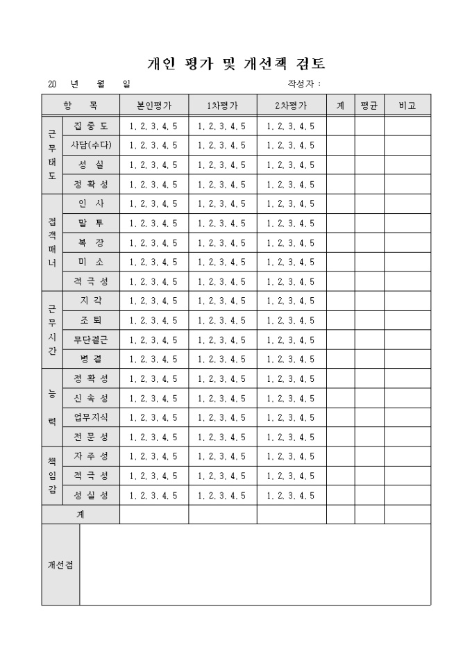9,000원/월개인의 업무태도등을 평가하고 아래 개선란에 개선책을 기입할 수 있는 서식입니다.