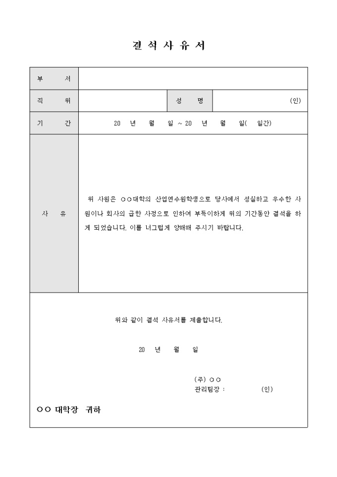 산업연수생으로 일하는 사원이 결석을 했을 시에 사유서를 제출 할 때 쓰이는 서식입니다.
