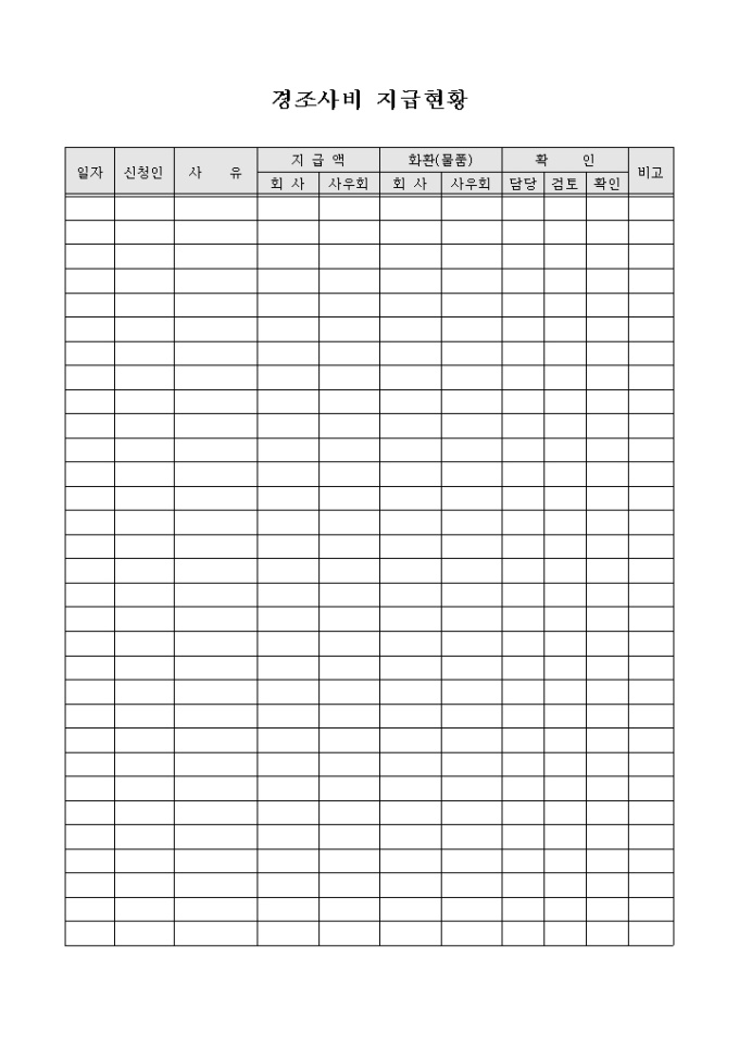 9,000원/월개인 경조사비 지급현황을 나타낸 서식으로 회사, 사우회로 구분하였으며 경조금이나 화환등의 물품으로 구분되었습니다