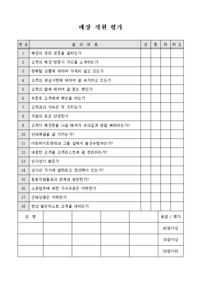 9,000원/월매장직원을 평가하는 서식으로 18개 항목의 상중하를 구분하여 사업장 책임자가 직접 채점하게 만든 서식입니다.