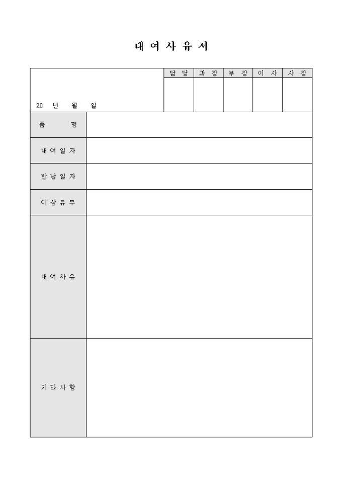 9,000원/월물품을 대여해 주고 대여일자, 반납일자, 대여사유, 특이사항 등을 기입할 수 있는 서식입니다.