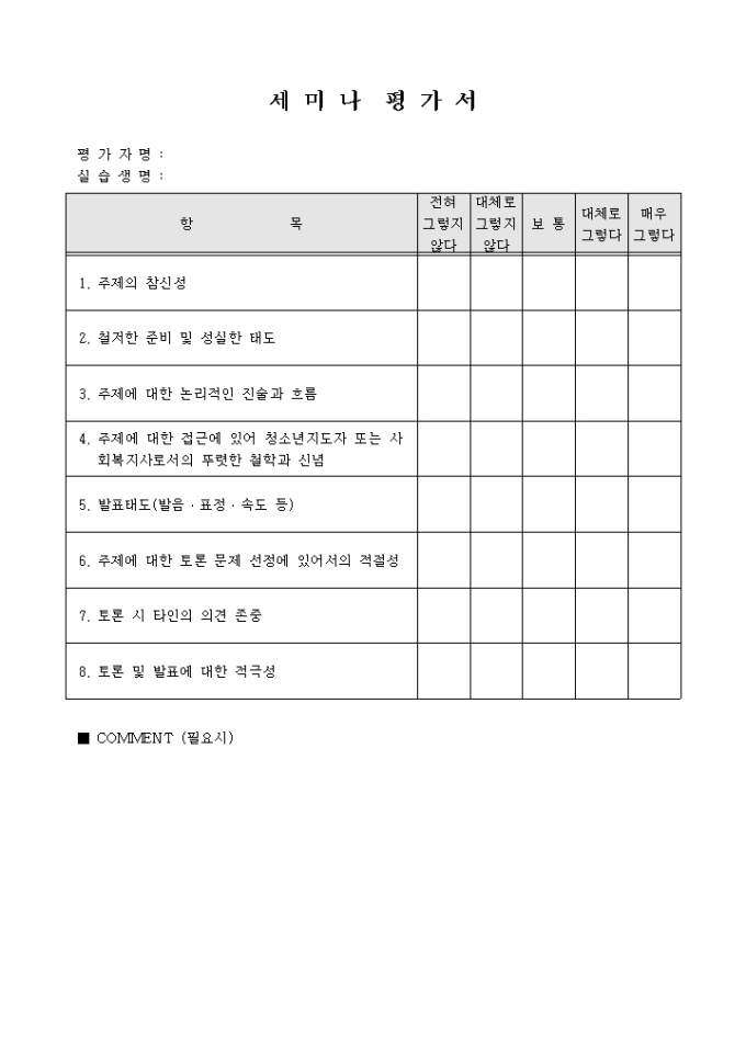 9,000원/월세미나 평가서로 항목별 평가를 할 수 있는 양식입니다.