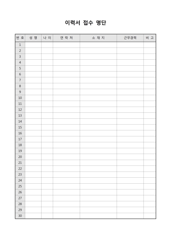 9,000원/월성명, 나이, 연락처, 소재지, 근무경력 등의 항목으로 구성된 이력서 접수명단 양식입니다.
