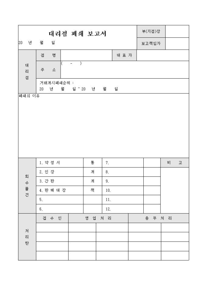 대리점의 폐쇠시 사용하는 보고서 양식으로 회수물건, 폐쇄이유, 대리점 정보, 처리란으로 구성되어 있습니다.