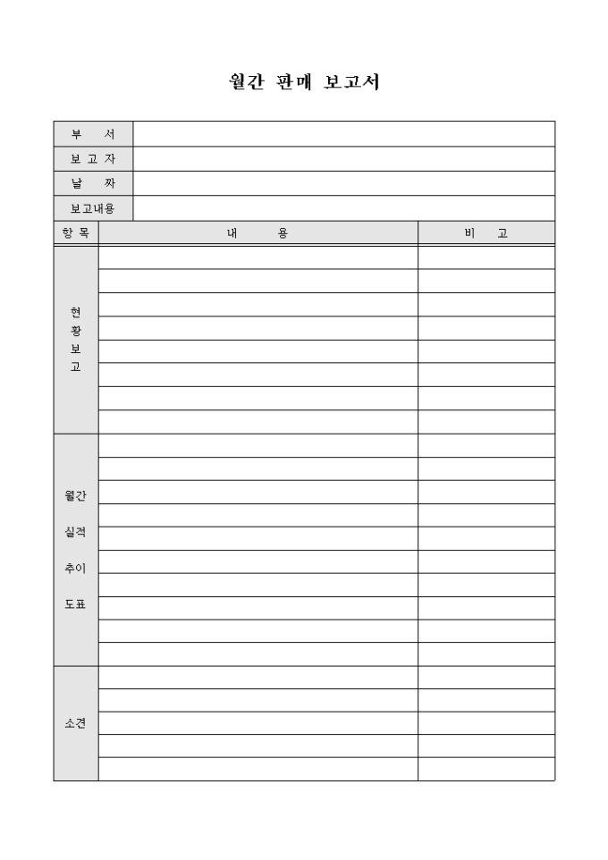 9,000원/월월간 판매 보고서 양식입니다. 부서, 보고자, 보고내용, 현황보고, 월간실적추이도표, 소견 등의 항목으로 구성되어 있습니다.