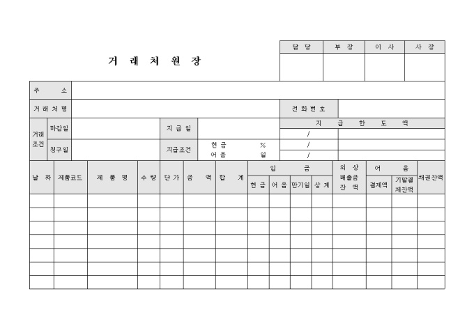 거래처의 정보를 기입할 수 있으며 거래품목의 입금여부, 외상매출금, 어음, 채권잔액 등을 표기할 수 있는 원장입니다.