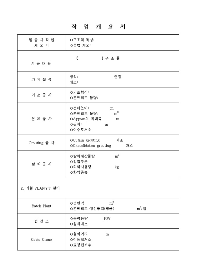 가 체 철 공,기 초 공 사,본 체 공 사,Grouting 공 사,발 파 공 사 등의 항목으로 구성된 양식입니다.