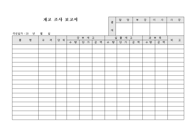 9,000원/월재고 조사 보고서로 품명, 규격, 단위, 장부재고, 실물재고, 과부족 등으로 구성되어 있습니다.