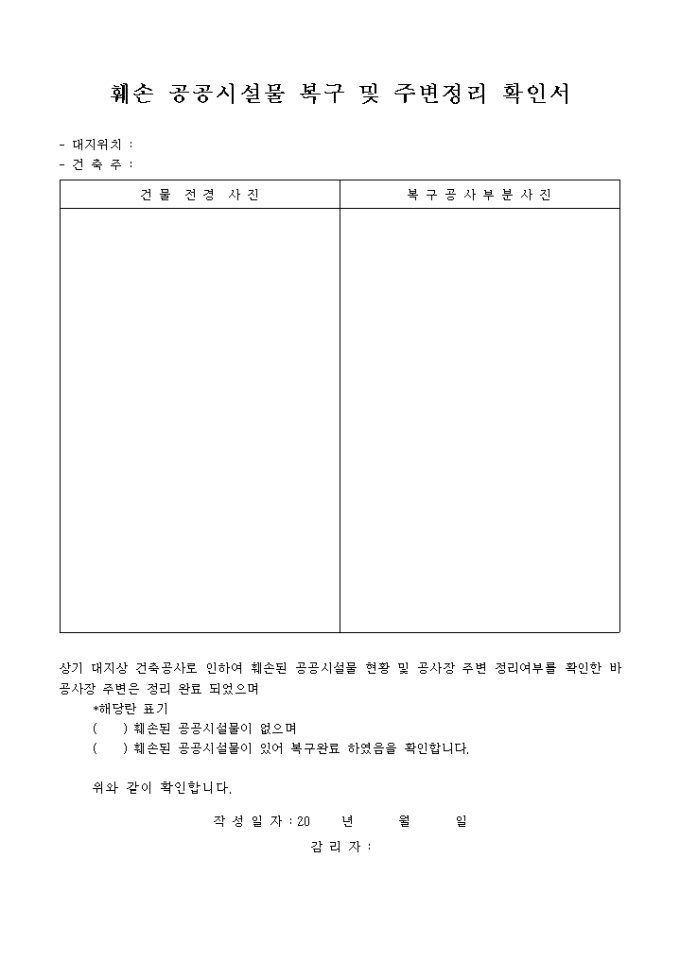 ( ) 훼손된 공공시설물이 있어 복구완료 하였음을 확인합니다.