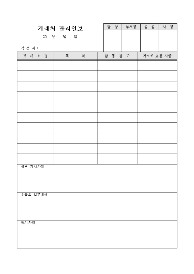 9,000원/월거래처의 방문목적, 활동결과, 거래처 요청사항 등을 기입하여 거래처 관리를 원활히 수행할 목적으로 만들어진 서식입니다.