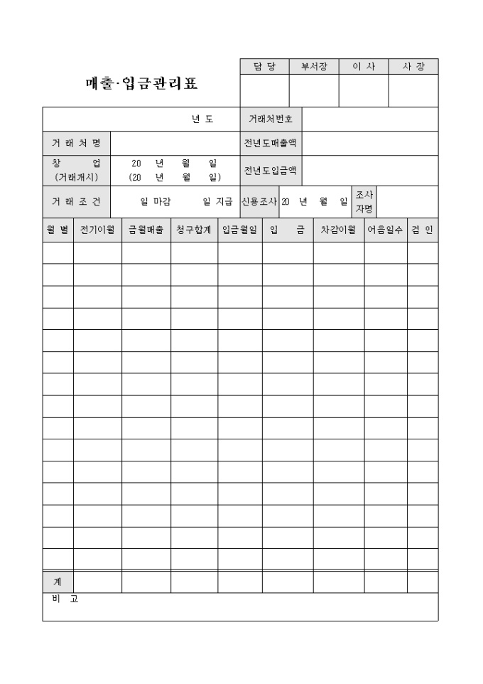 거래처의 매출 및 입금 규모, 거래조건, 세부 거래내역 등을 기입할 수 있도록 만든 서식입니다.