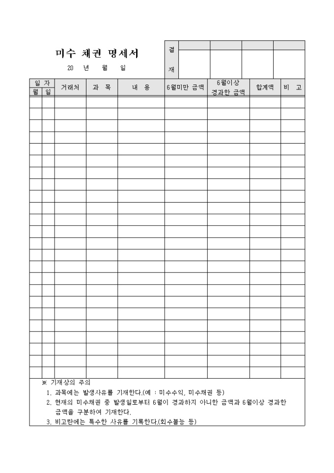 거래처 미수채권을 관리하기 위한 서식으로 6개월미만 채권, 6개월이상 채권등으로 분류하여 그 과목 및 지연사유를 기입할 수 있도록 만든 서식입니다.